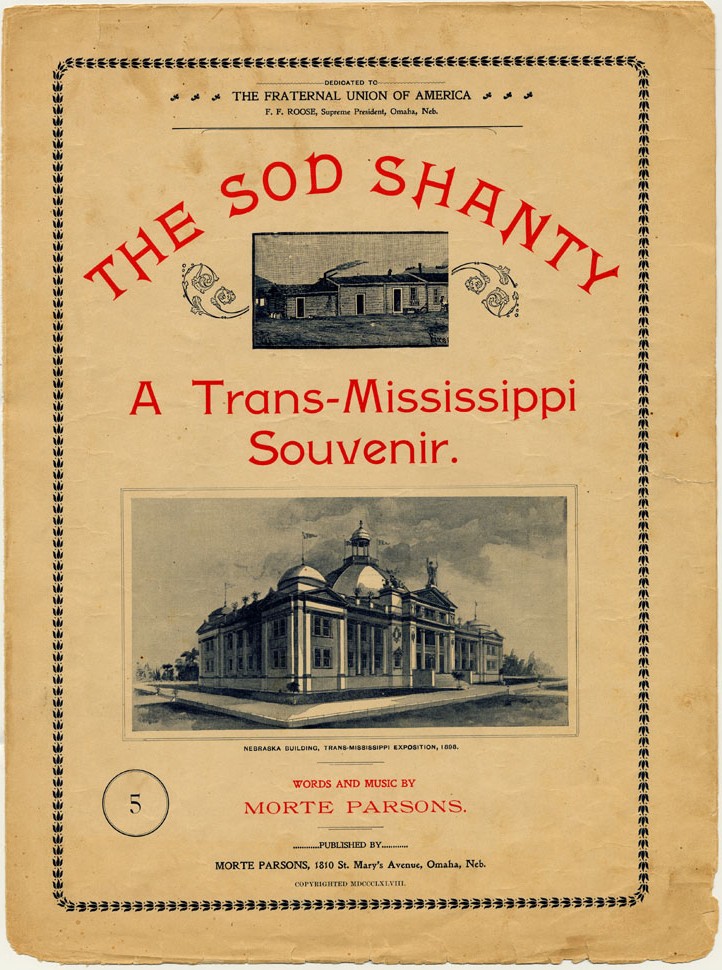 "The Little Sod Shanty on the Plains," a song written for the Trans-Mississippi and International Exposition. Sheet music cover includes images of a shanty and of the Nebraska State Building on Bluff Tract. (Ibid.)