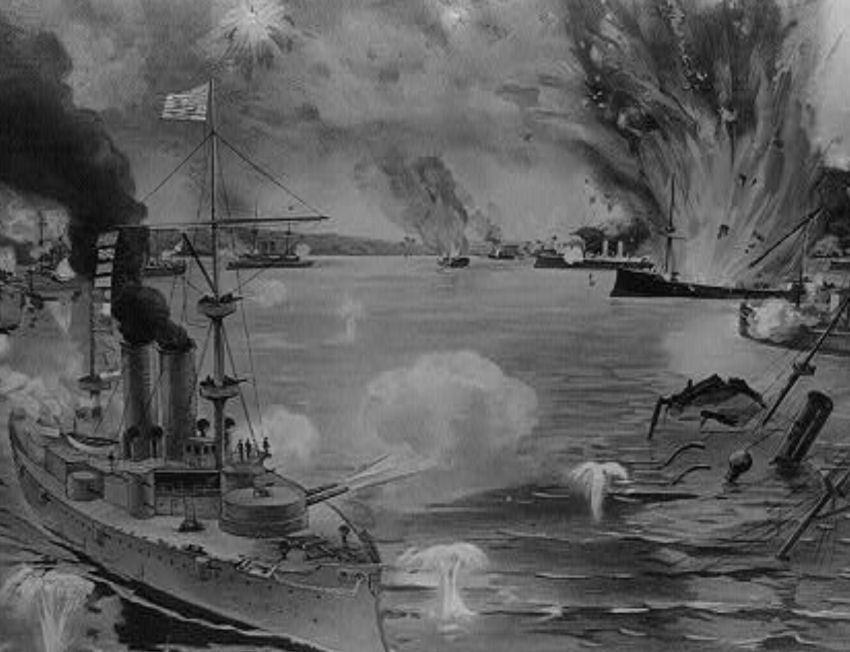 Print showing naval battle in Manila Bay, Philippines, between the Asiatic Squadron of the U.S. Navy under the command of Admiral George Dewey and the Spanish fleet on May 1st 1898. Muller, Luchsinger & Co., 1898 (Library of Congress)