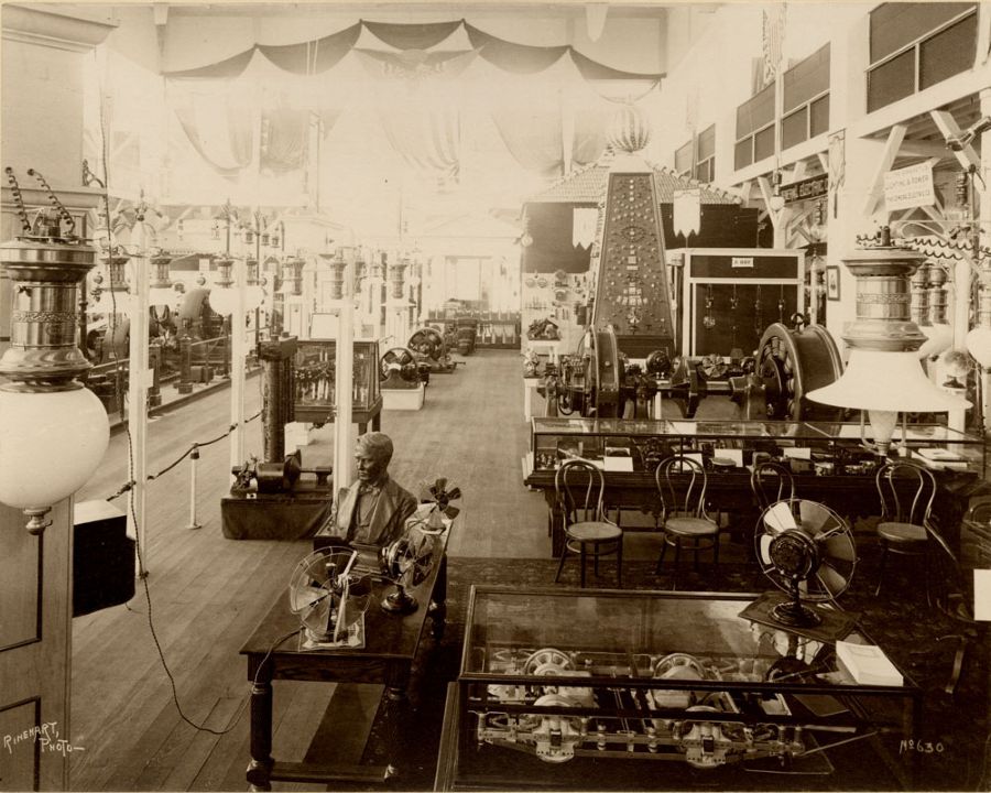 Edison bust, fans and motors inside Grand Court, North East Interior of Machinery & Electricty Building by F. A. Rinehart, Center for Digital Research in the Humanities UNL-Libraries.