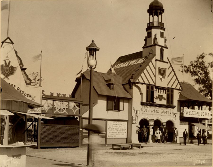 The German Village (catering to those who attend the concerts) was located in the Midway and was known for its "Continuous Vaudeville, The Celebrated Vienna Kitchen, Edelweiss Beer, and Kirschner's Famous Lady Orchestra."