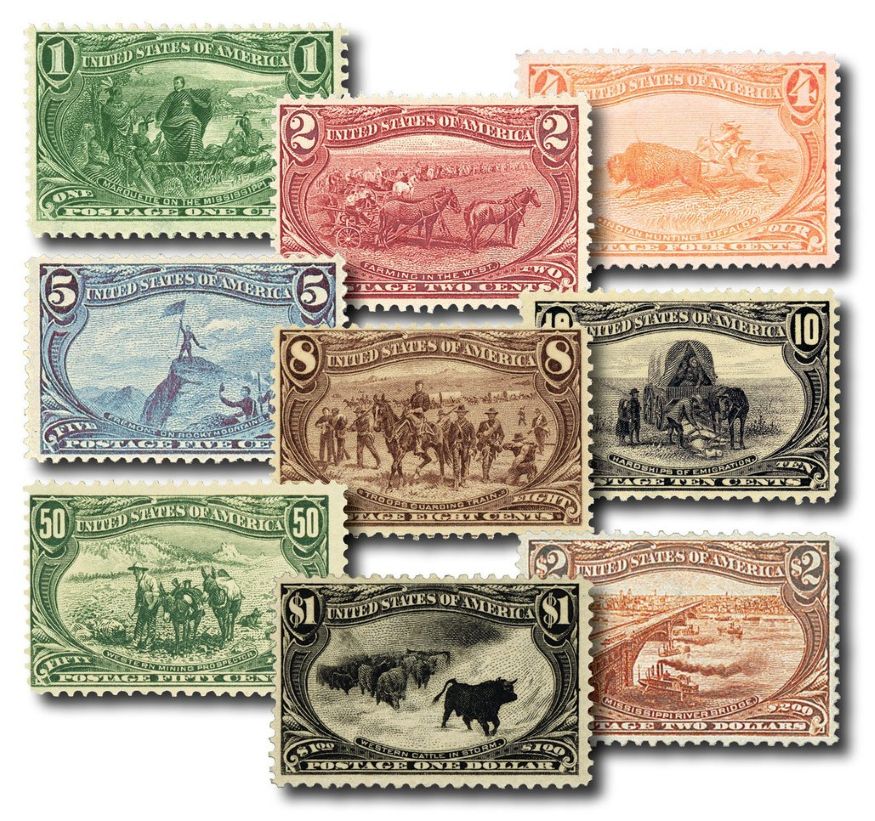 In 1898 the U.S. Postmaster General authorized a nine stamp set of stamps to promote and commemorate the 1898 Trans-Mississippi & International Exposition. The 1 center to $2.00 stamps were supposed to be printed in two colors, but because the Spanish-American War broke out they were only printed with one color.