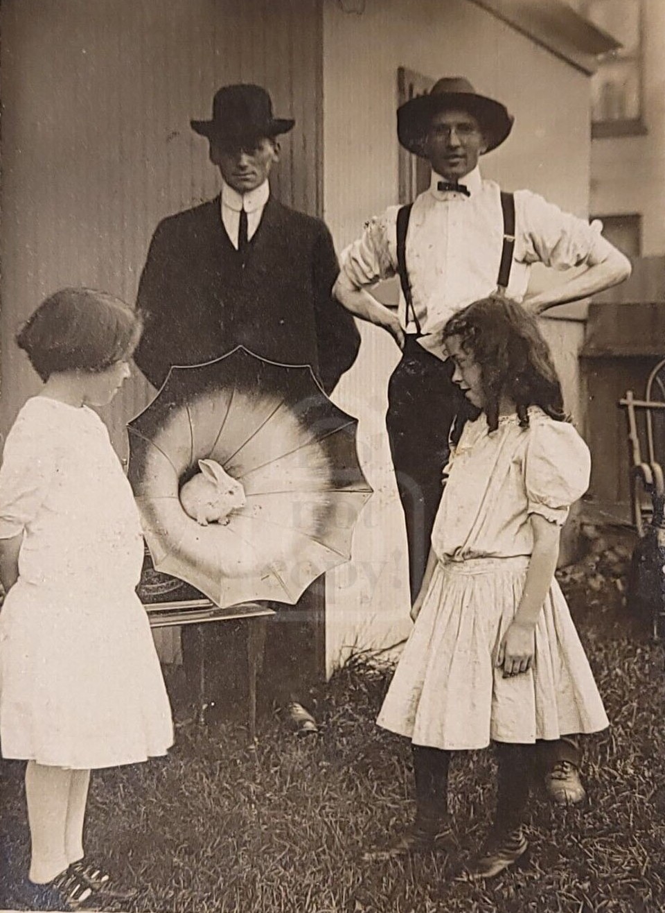 Two children with rabbit inside Phonograph horn. |