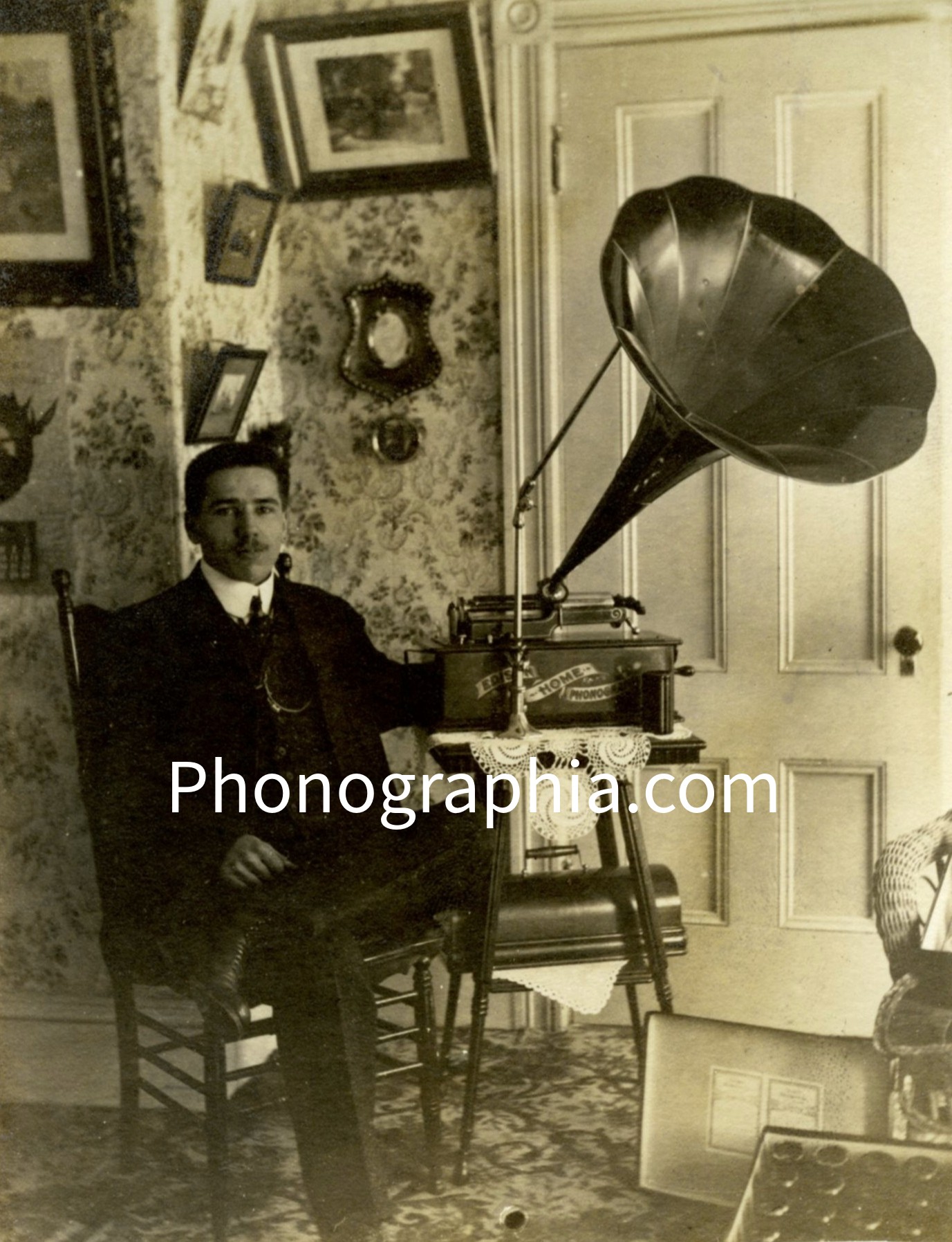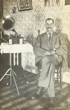 Man seated next to Edison Standard Phonograph, ca. 1910 |