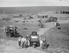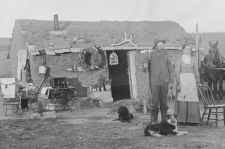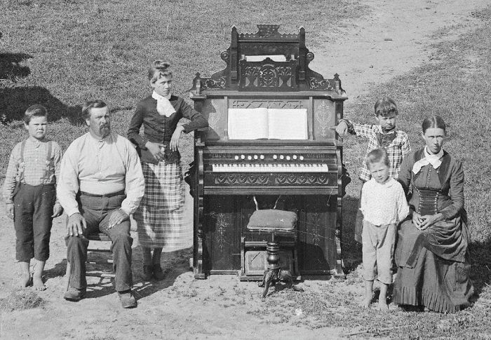 Pump organ at Sod House, 1890's by Solomon Butcher The David Hilton family near Sargent, Nebraska. Mrs. Hilton and her eldest daughter were adamant that they not be photographed in front of their sod house, because they wished to send copies of the picture to friends and relatives elsewhere and thought it embarassing to be seen living in a house of dirt. But they did want to be seen with their new pump organ, so they made Mr. Hilton and the photographer drag the organ out of the house for the photographs, then drag it back in again. (Courtesy History Nebraska)