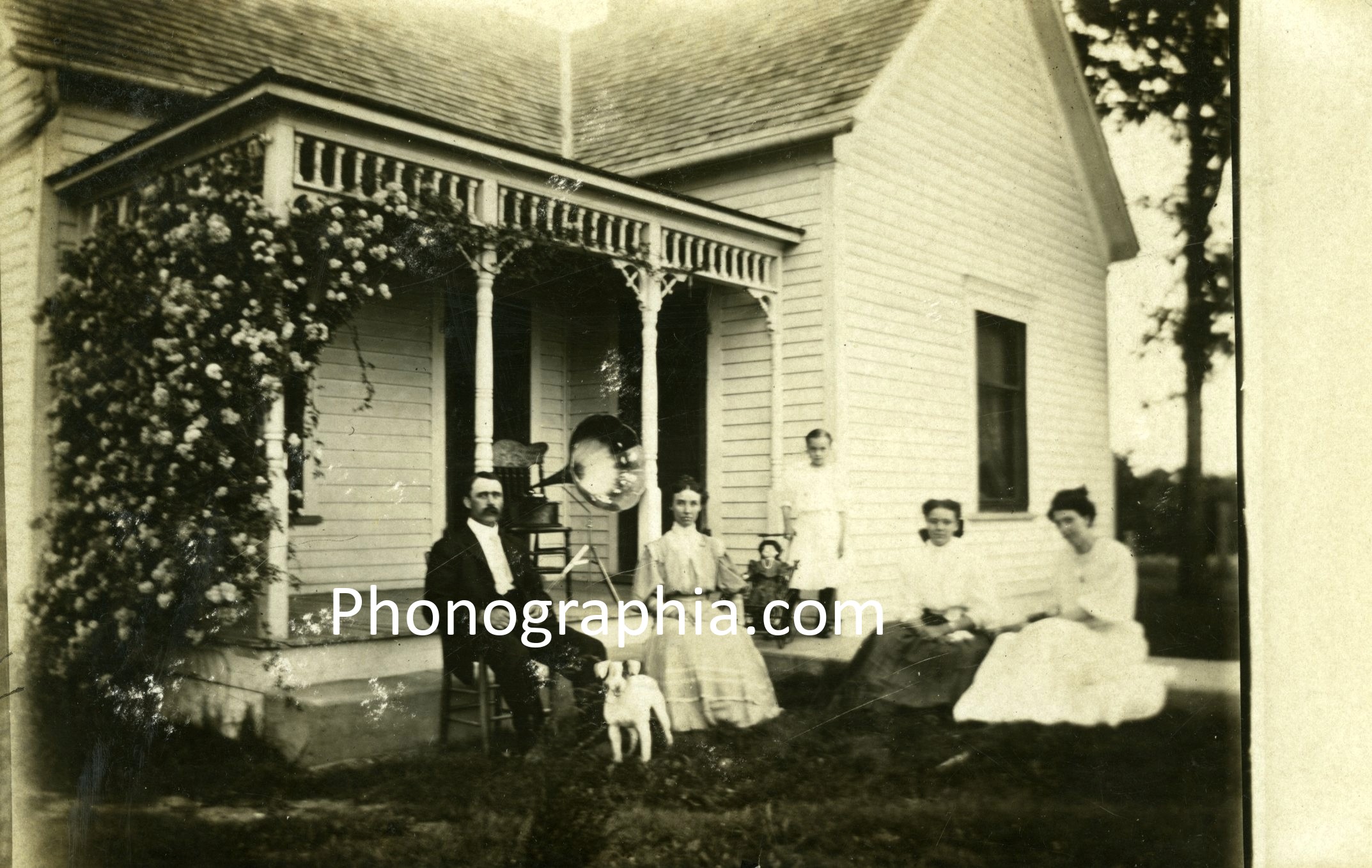 Billings Family portrait with Phonograph. Allen Billings family photographed outside their house with doll and Phonograph on chair - morninglory horn with flowers, ca. 1910. (PM-0025) |
