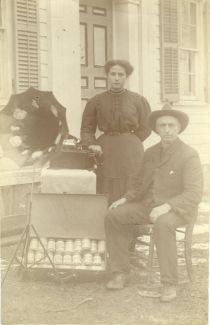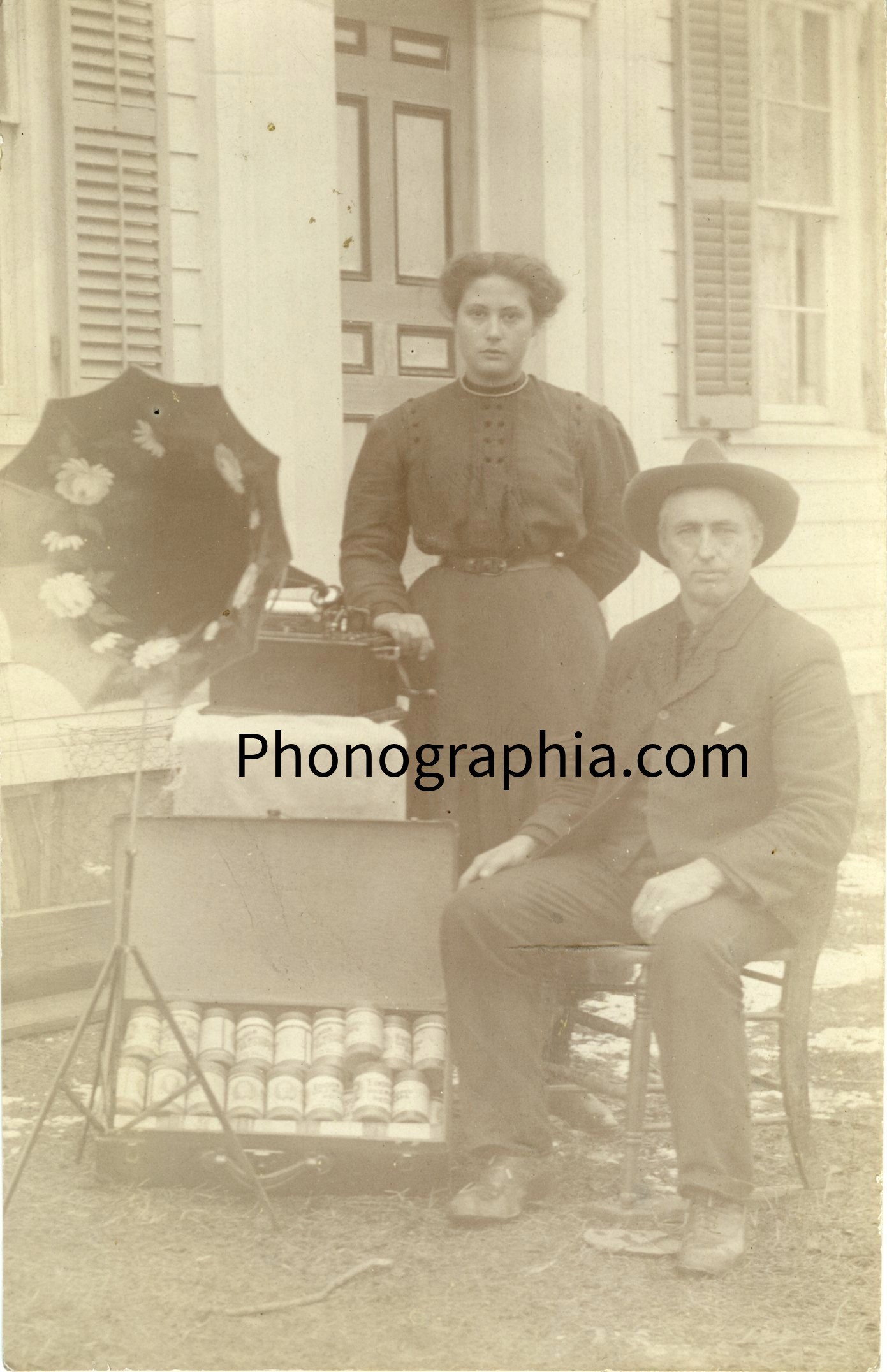 Portrait of man and woman with Edison phonograph. |