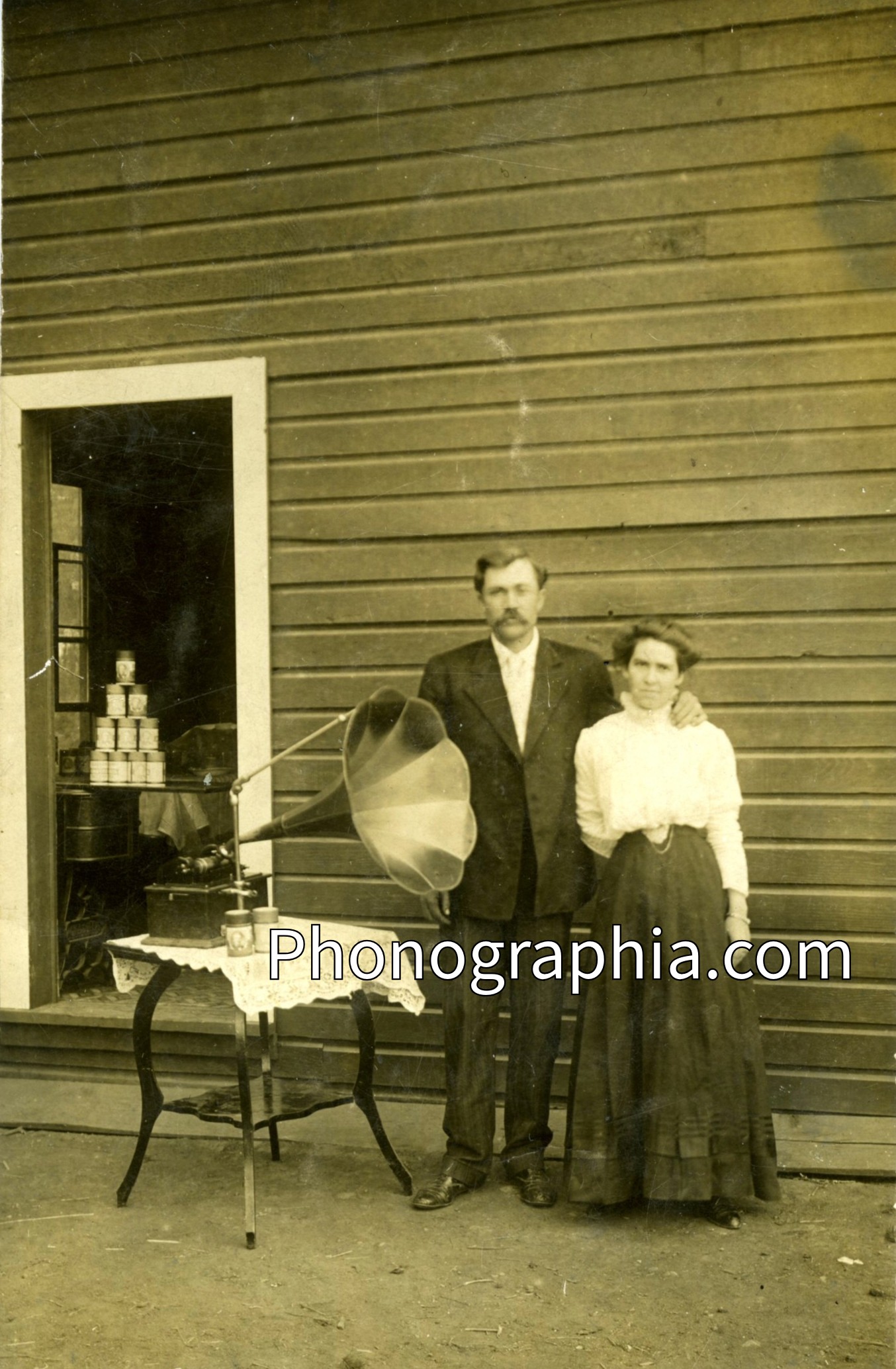 Tom and Mary Combs with Edison Standard 1909 (PM-0671). A sewing machine can be seen inside the doorway with Edison cylinder record boxes stacked on. |