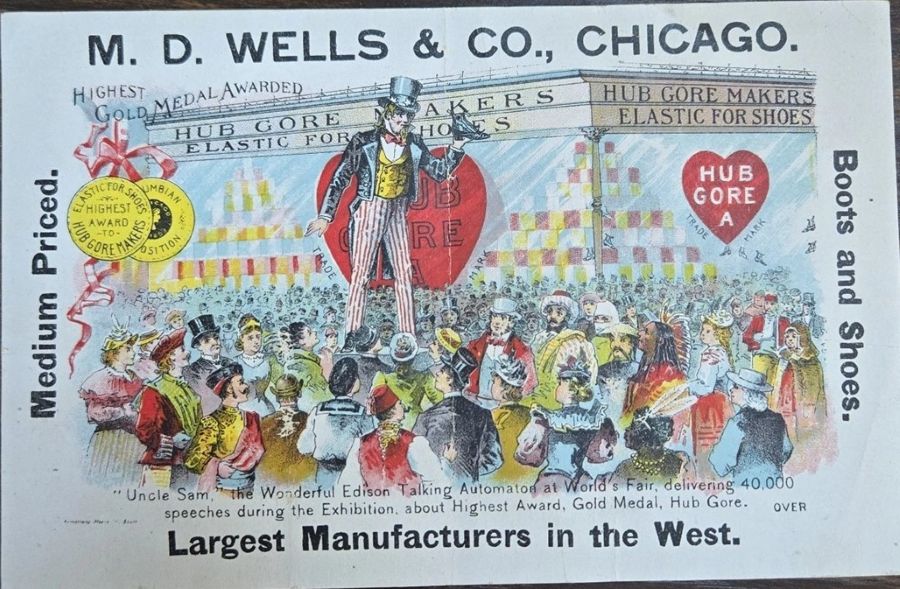 card showing Uncle Sam promoting Hub Gore shoes at the 1893 Columbian