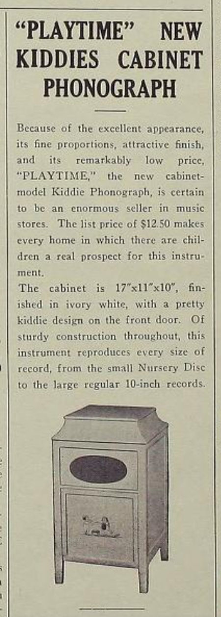 In September 1925 The Talking Machine World announced that a new cabinet Kiddie Phonograph was being released named the "Playtime."